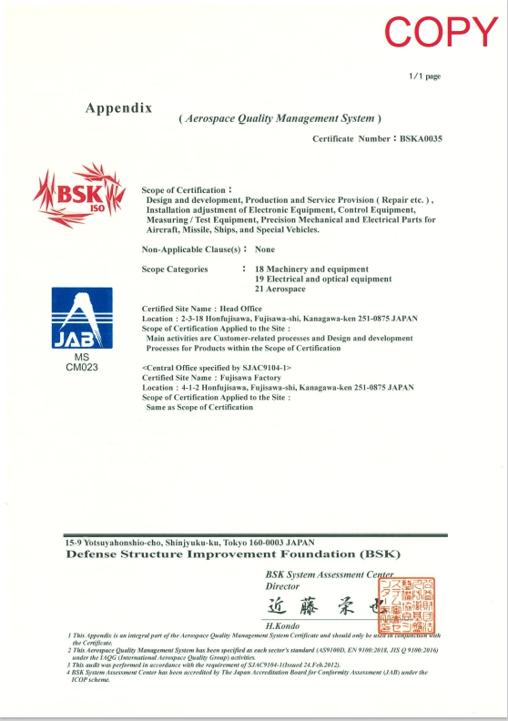 | Major Customers | Japan Ministry of Defense Mitsubishi Heavy Industries, Ltd. Kawasaki Heavy Industries, Ltd. SUBARU CORPORATION ShinMaywa Industries, Ltd. Mitsubishi Electric Corporation FUJITSU LIMITED NEC Corporation TOSHIBA CORPORATION GS Yuasa Corporation Sumitomo Precision Products Co., Ltd. Oki Electric Industry Co., Ltd. The Japan Steel Works, Ltd. SINFONIA TECHNOLOGY CO., LTD. |